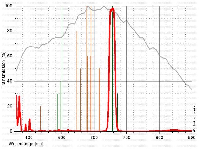Filtr propouštějící pouze v úzkém pásmu vodíku H-alfa, určený pro CCD fotografii, s pološířkou 12 nm (lze použít např. v kombinaci s SII a O III). Rozměr 50x50 mm, určeno pro montáž do filtrového kola.